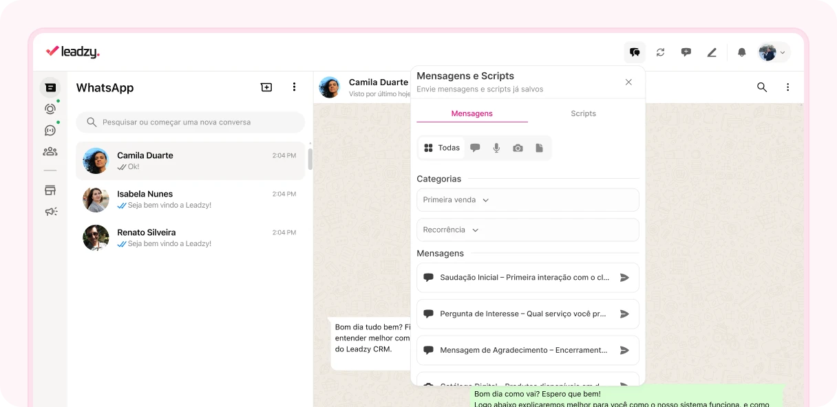 Leadzy Chat: focado em produtividade e automação no WhatsApp Web, permitindo enviar mensagens prontas, scripts, áudios, agendamentos e fazer follow-up de forma rápida.