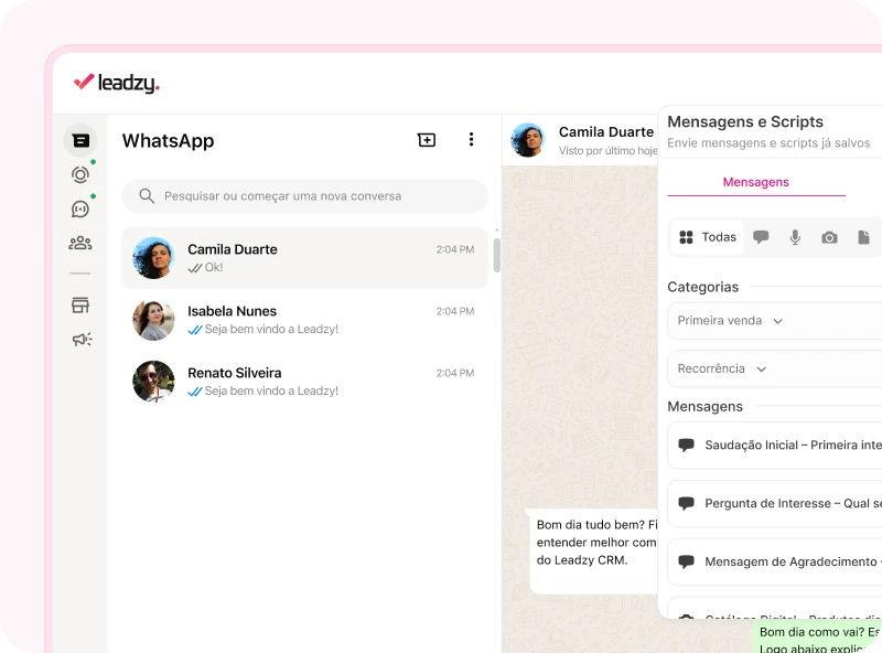 O Leadzy é um ecossistema integrado ao WhatsApp Web, composto por uma extensão para Google Chrome e uma plataforma online. A extensão adiciona recursos de automação e produtividade ao atendimento no WhatsApp, enquanto o CRM permite organizar contatos, funil de vendas, tarefas e histórico de negociações dentro do WhatsApp e ao mesmo tempo salvando em núvem. Assim, você vende, atende e gerencia clientes no mesmo fluxo, sem alternar entre ferramentas.