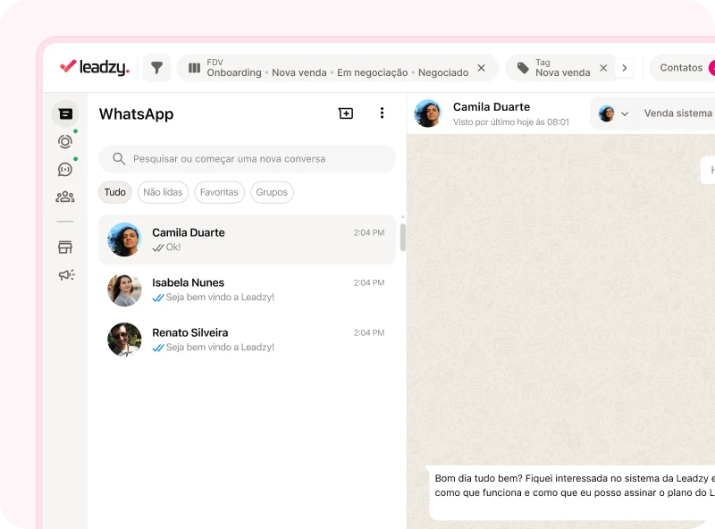 O Leadzy é um ecossistema integrado ao WhatsApp Web, composto por uma extensão para Google Chrome e uma plataforma online. A extensão adiciona recursos de automação e produtividade ao atendimento no WhatsApp, enquanto o CRM permite organizar contatos, funil de vendas, tarefas e histórico de negociações dentro do WhatsApp e ao mesmo tempo salvando em núvem. Assim, você vende, atende e gerencia clientes no mesmo fluxo, sem alternar entre ferramentas.